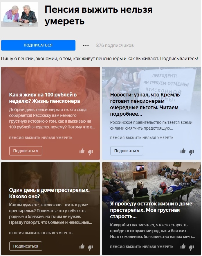 Название канала: "Пенсия выжить нельзя умереть" Тематика: Жизнь пенсионеров в условиях кризиса в стране Дата первой публикации: 26 мая 2018 года Количество подписчиков на 7-е октября 2018: 876 человек Автор: --------- Ссылка: здесь Канал, который на наш взгляд, создан исключительно на волне обсуждения и принятия новой пенсионной реформы в Российской Федерации, а также её возможных последствий. «Пенсия выжить нельзя умереть» является примером канала-паразита, возникшего на волне определенного социального тренда, популярного в обществе и вызывающего беспокойство. Стоит отметить, что эту тему подхватили все, кому не лень, в попытках за счет нее привлечь как можно больше аудитории, чтобы впоследствии заработать на информации, которая не является эксклюзивной и доступна каждому. В любом случае, не стоит забывать, что в бочке дегтя так же может быть ложка мёда – следовательно и в ленте «Пенсия выжить нельзя умереть» определенная аудитория может найти полезные для себя сведения. Оцен