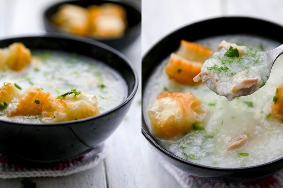 Чжоу — каша (отвар) один из традиционных завтраков в Китае. Но это не та каша, к которой привыкли мы. Основа — это конечно крупа (рис, пшено или кукурузная крупа), но никакого молока и масла. Готовится она в большом количестве воды, пока крупа не разварится, и каша будет напоминать кисель по консистенции. На первый взгляд не очень привлекательно, но добавьте к этому острые, соленые или маринованные овощи, тысячелетние яйца, фасоль, мясо или колбасу, а может быть вам захочется послаще тогда добавьте китайские финики, возьмите палочку Ютяо и макайте ее в сгущенное молоко. Теперь это не просто рисовый отвар, а отличный завтрак. Поехали. Ингредиенты: 120 г – риса (длинного или круглого) 3 л – воды 2 шт – куриных бедра 3-4 стрелки – зеленого лука 4 см – имбиря 3-4 веточки – кинзы (по желанию) соль и молотый черный перец по вкусу Приготовление: Вы может добавить к этому палочки Ютяо или блинчики с зеленым луком (упрощенная версия) и маринованные огурцы. Где я беру соусы, пасты, приправы