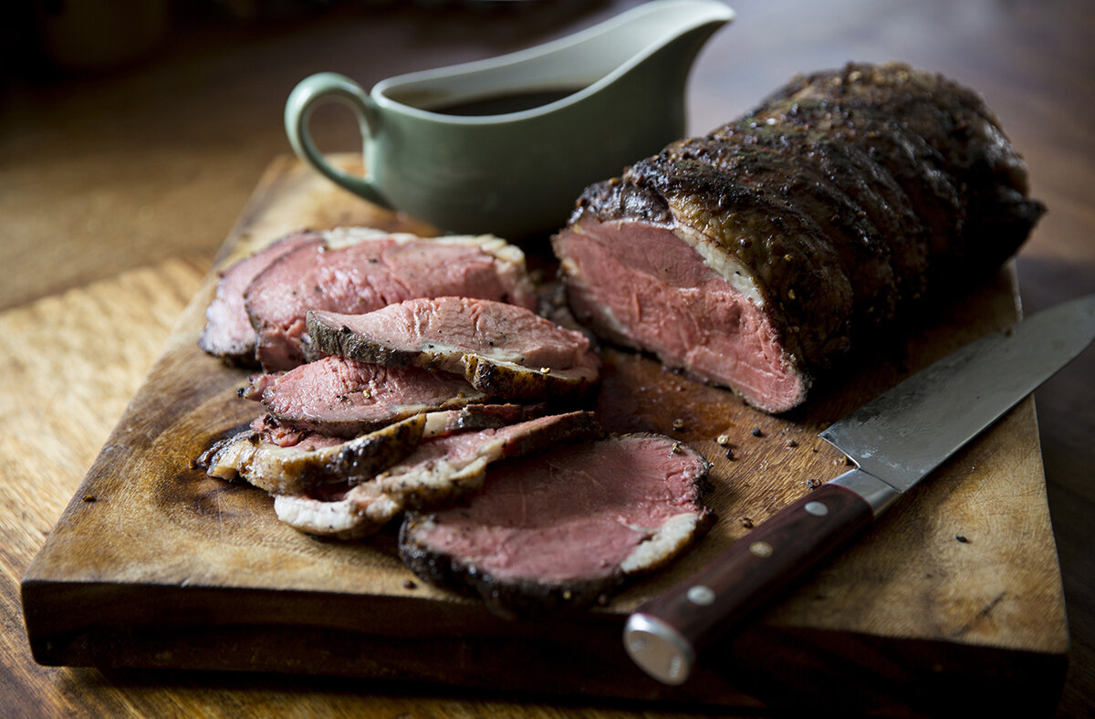 Ингредиенты: Говяжья вырезка - 4,8 - 6 кг.; Сливочное масло - 250 гр.; Мясной бульон - 1 литр; Соль по вкусу. Способ приготовления: Ростбиф жариться без всяких приправ, кроме соли, и считается самым здоровым блюдом, потому что в нем сохраняются все питательные соки мяса. Для ростбифа следует взять мясо с костями, потому что около костей с обеих сторон вырезки - филейная и затылочная. Для порции на 6 - 8 человек достаточно 12 – 15 фунтов (4,8 – 6 кг) говяжьей вырезки. Вся задача приготовление ростбифа заключается в том, чтобы сохранить сок в мясе, не подать совсем сырым и не пережарить. Купленный для ростбифа кусок мяса нужно вымыть, окатить холодной водой, снять пленки с филея, а также вытереть полотенцем досуха и натереть кругом солью. Затем ростбиф положить на противень, жирной стороной вниз и облить горячим растопленным сливочным маслом. На противень налить немного бульона и поставить в жаркий духовой шкаф (220 градусов), чтобы мясо сразу зарумянилась. Когда зарумянится одна сто