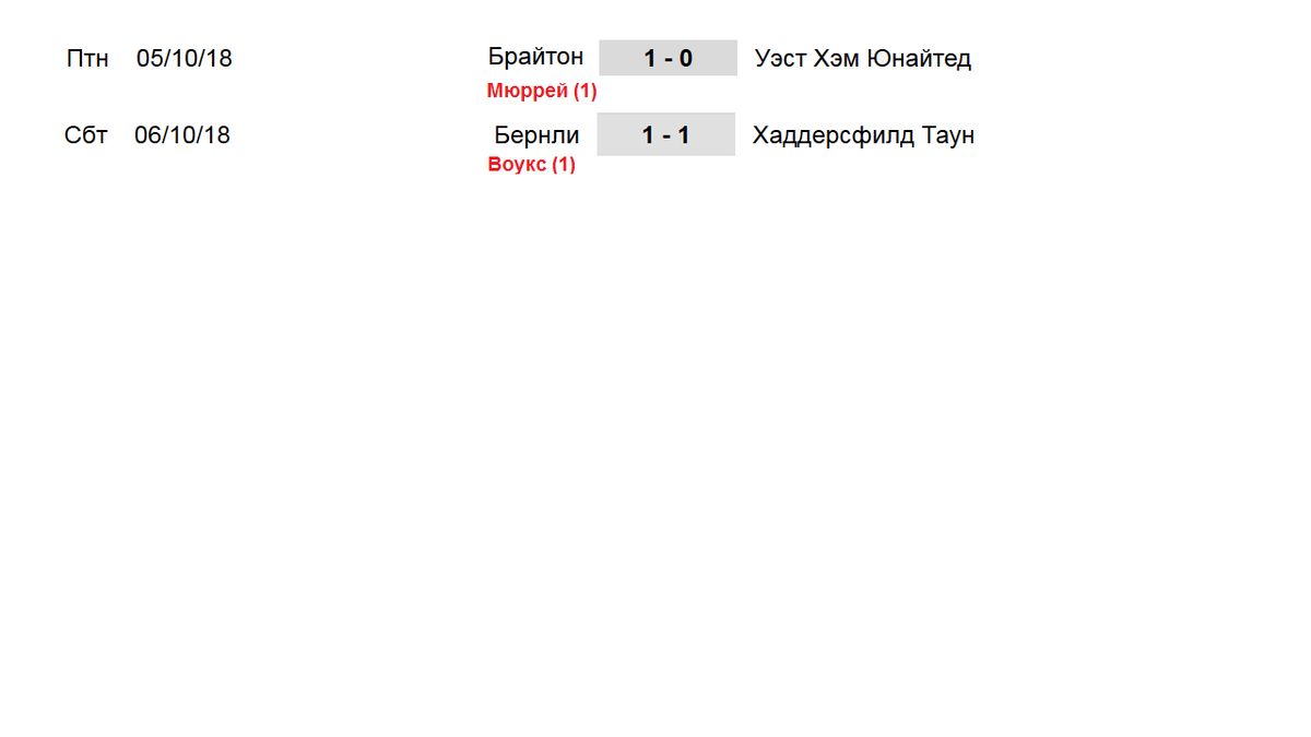 Здравствуйте, завершились все матчи в английской премьер лиге, и будет у нас полный обзор, полный фарш. Также будет сегодня и полный обзор чемпионатов России и Испании, ух и неделя выдалась там. Брайтон обыгрывает дома Вест Хэм 1-0. Гленн Мюррей забил, и это его внимание уже 5 гол. Жаль, что ему уже 35ть, а так бы мог и в сборную быть вызван. Этот результат немного удивил меня, потому что Брайтон играет в последнее время плохо, 6 матчей без побед, в то время как Вест Хэм наоборот на подъеме, ничья с Челси, обыгран МЮ, и 8 мячей они отгрузили в кубке. И тут проигрывают. Брайтон выиграл 3ю в подряд очную игру у Вест Хэма. Бернли Хаддерсфилд 1-1. Выделю Сэма Воукса, который забивает второй тур в подряд, и приносит бордовым очки. Хаддерсфилд ни одной игры в этом чемпионате не выиграл ещё. Полный аутсайдер. Кристалл П уступает дома 0-1. 9 лет Вулверхэмптон не выигрывал у Пэлэса. Уже 3 игры в чемпионате Кристалл П не может выиграть. А волки 6 туров не знают уже поражений. Вулвурхэмпто