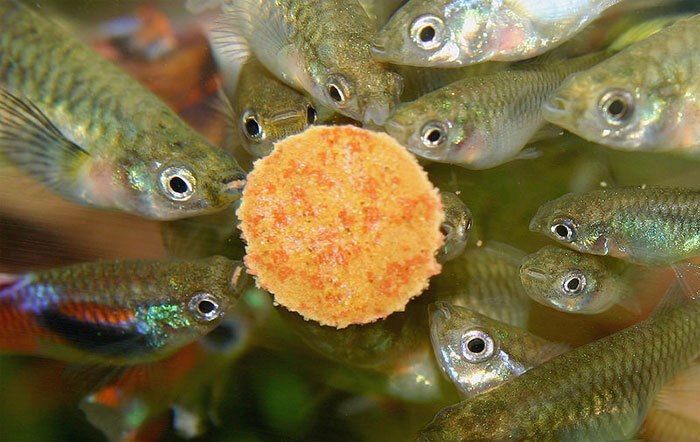 Гуппи возглавляют разные списки: самые неприхотливые, самые популярные, плодовитые, живучие, нетребовательные аквариумные обитатели. Неудивительно, что именно их часто выбирают в качестве первых питомцев аквариумисты-новички. Проблем с гуппи практически не бывает, так как они не капризны и не привередливы, в том числе и в вопросе кормления. Особенности кормления гуппи Кормят гуппи минимум трижды в день, а лучше – подсыпать им угощение маленькими порциями каждые 4 часа. Многие владельцы аквариумов не утруждают себя и дают своим подопечным пищу раз в день, высыпая суточную норму. Но такая кормежка будет настоящим пиром для гупешек, не страдающих отсутствием аппетита, и они будут чрезмерно объедаться. Для здоровья этих крох полезнее дробное питание, в качестве пищи можно использовать следующие продукты: Независимо от того, насколько рацион аквариумных жителей разнообразен, в него рекомендуется добавлять витамины – А, Д, Е. Обычно их приобретают в виде капель и добавляют в пищу –