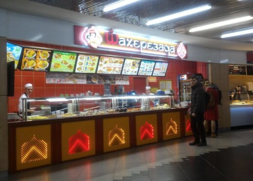 Я довольно часто принимаю пищу на фудкортах в различных ТЦ. Чаще всего это бывает "Теремок", реже - KFC или Макдоналдс. Но в один из дней во всех вышеперечисленных точках были большие очереди, а я спешил и решил попробовать поесть в сети "Шахерезада". Довольно часто обращал на них внимание, так как почти во всех торговых комплексах в обед стоят мальчики и раздают именно их листовки. Подошёл к их витрине, посмотрел. Понял, что здесь тоже есть комбинированные обеды. Заказал самый дорогой - за 259 рублей (да, цена меня не смутила, а зря!). В этот набор входит первое (на выбор), салат (на выбор), второе с гарниром (на выбор), напиток - тоже на выбор, и кусок хлеба. Вроде бы неплохо. Взял, оплатил, сел за стол и начал есть. Солянку я съесть не смог. У меня сложилось ощущение, что старое мясо и какие-то ошмётки сосисок просто сварили в каком-то прогорклом масле, изрядно сдобрив всё это перцем. Отставил. Салат съел - баклажаны с морковью оказались вполне неплохими. Второе - заветренная котл