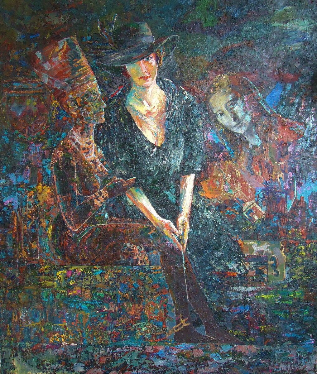 Содержание картины "Селфи с Джокондой", которая находится в экспозиции выставки "Улыбка Джоконды"в Генеральном Консульстве Республики Турция можно изложить как перефразировку и модернизацию "Троицы" Андрея Рублёва с образами Отца, Сына и Святого Духа . В роли Отца - Джоконда, Западная Культура, Цивилизация, сходившая на Голгофу и предлагающая всему человечеству периодически проделывать этот путь. Под ней две Мировых войны , французская революция, Великая Октябрьская социалистическая революция в России с падающим куполом русского храма. В роли Сына - моя супруга Марина в экспрессивной светящейся манере с саркастическим поднятием правой части губы - живой символ России, смешения кровей, красивая и динамичная, позирующая для селфи с Джокондой и Нефертити. В роли Святого Духа - Нефертити и забытая древняя тамрийская цивилизация с построением дома внутри себя для проживания духовных ценностей. Кисти рук Марины образуют зарождения цветка от колена Нефертити как символ Возрождения Росси