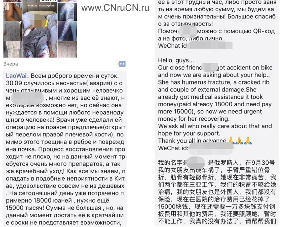 "А, и так сойдет!!! Со мной этого не случится никогда" - русское "на авось" не всегда срабатывает. В данном посте в ленте "Моменты"содержится просьба о материальной помощи. Как видите, девушке пришлось прибегнуть к призыву о помощи к нашим соотечественникам, когда произошел несчастный случай и она оказалась на больничной койке. Конечно, с каждым человеком может случиться несчастье и мне очень жаль, что девушка попала в аварию. К тому же, это случилось за границей, в Китае. Как видите, у нее нет страховки, которая покрыла бы расходы на лечение. Поэтому, собираясь в Китай, ОБЯЗАТЕЛЬНО заранее позаботьтесь о медицинской страховке. В Китае все мед. услуги платные и без денег не приедет даже Скорая Помощь. Поэтому, если вы окажетесь на больничной койке, без больших денежных затрат вам не обойтись. Спасет в этом случае только страховка. Какие виды медицинской страховки "работают" в Китае читайте в этом посте. Желаю вам хорошего здоровья! Берегите себя, "подстелите соломку" заранее.