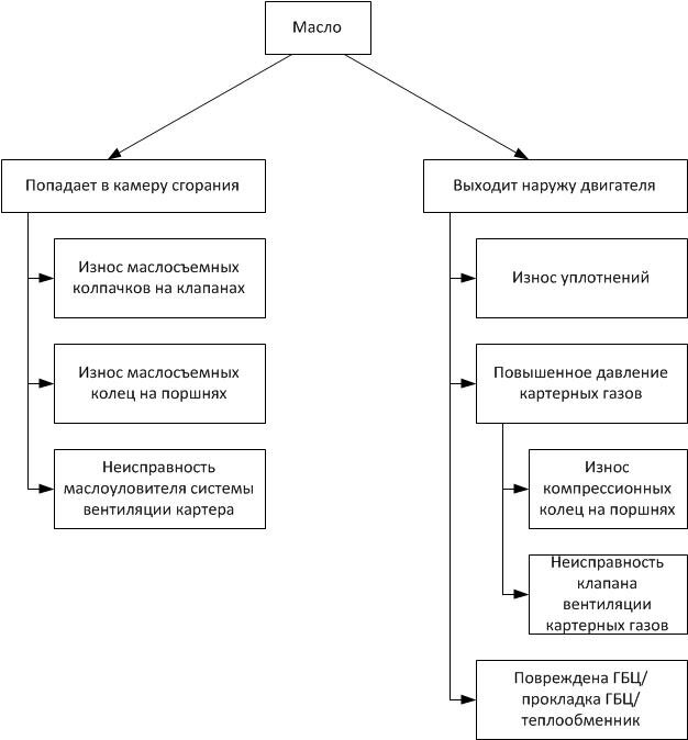 Собственно, уходить масло может либо наружу двигателя через уплотнения, либо попадать в камеру сгорания. Это, в свою очередь, может происходить по многим причинам. Проще всего выразить это в форме такой картинки: