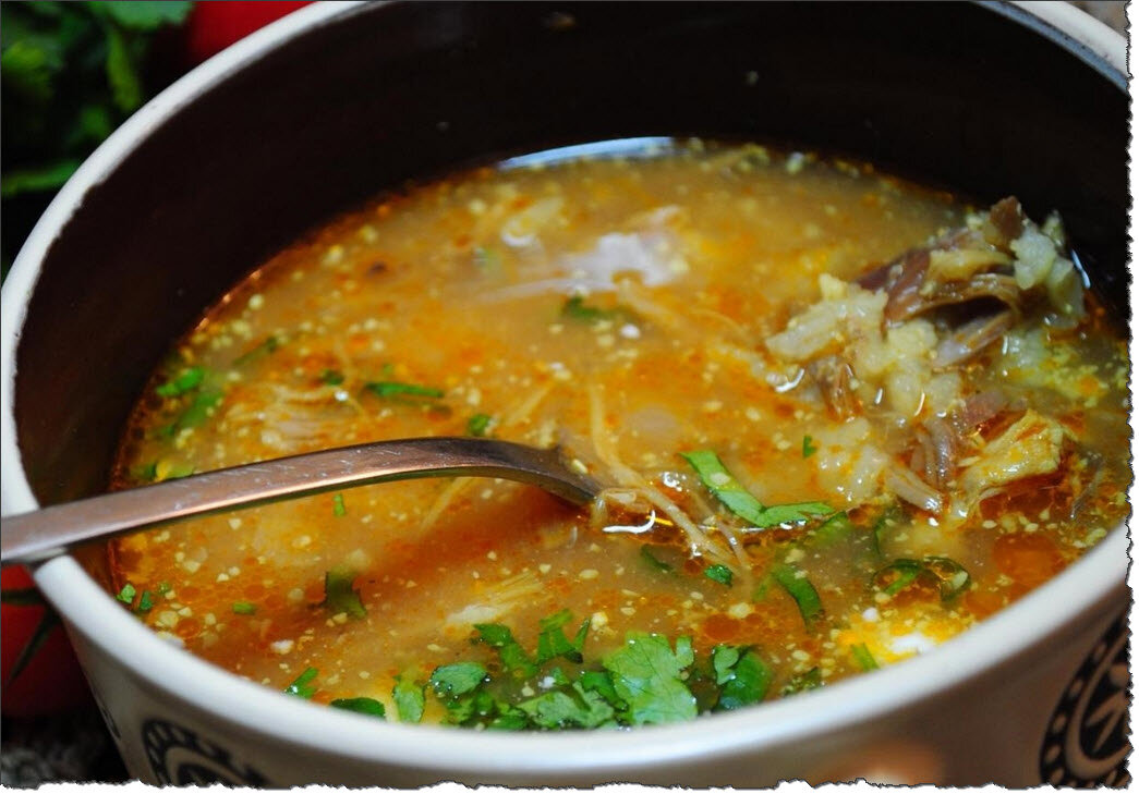 Нам понадобятся: Баранина 1кг Лук репчатый 2шт Корень петрушки 1шт Кориандр семена 1ст.л. Мука кукурузная 1ст.л. Рис ½ стакана Петрушка 1пучок Кинза 1пучок Базилик 1 пучок Подкислитель- тклапи или ткемалевый соус по вкусу Честнок 2-4 зубчика Лавровый лист/перец Хмели-сунели 1ст.л. Корица 1щепотка Острый красный перец 1шт Шафран 1щепотка Начнем конечно с бульона, отварим наше мясо на медленном огне. Когда мясо сварилось, достанем его и отложим в сторонку, а в бульон опустим рис. Лук порежем мелкими кубиками и обжарим на сковороде в растительном масле. К обжаренному луку добавим кукурузную муку и тоже обжарим. Нарежем корень петрушки. Рис варится уже минут 10, добавляем к нему лук, нарезанный корень петрушки, молотый кориандр, лавровый лист и черный перец горошком. Возвращаем мясо в бульон. И не забываем посолить. Зелень петрушки, кинзу и базелик мелко порубим. В бульон добавим ткемалевый соус, положим острый перец и порубленную петрушку. Пробуем наш суп и добавляем что еще не
