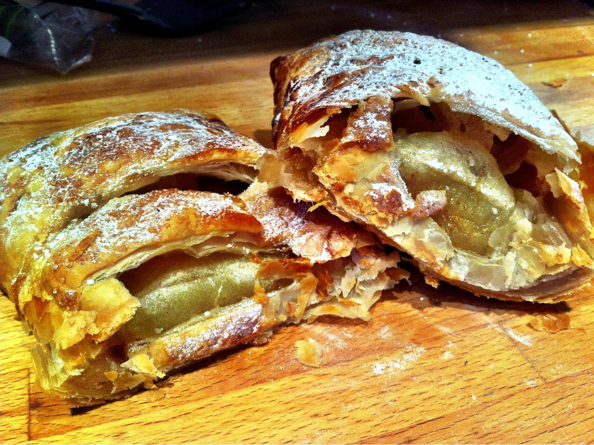 Легкий рецепт ленивого, но очень вкусного штруделя с яблоками... Ингредиенты: слоеное тесто бездрожжевое - 1 пласт яблоки - 1-2 шт. печенье типа "Юбилейное"- 50 гр. корица - 1/2 чайной ложки сахар - 2-3 ст. ложки орехи по наличию масло сливочное - 1 ст. ложка яйцо для смазывания Яблоки очистить от кожицы и порезать мелким кубиком или тонкими пластинками. Печенье измельчить в неоднородную крошку. Орехи мелко порубить. Пласт теста раскатать толщиной 2 мм. На 3/4 части выложить печенье и орехи. Сверху выложить яблоки. Посыпать все сахаром и корицей. Свернуть тесто в рулет. Смазать штрудель яйцом и сделать сверху надрезы для выхода пара. Выпекать при температуре 200 градусов в течение 40-50 минут. Приятного чаепития!