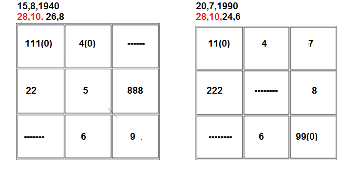 СМЕНИТЬ СТРАТЕГИЮ Существуют даты, где совпадают не все дополнительные числа. Допустим, совпадают только первое и второе, причём, они и стоят на том же месте! Пример: 15,8,1940 28,10,26,8 20,7,1990 28,10, 24,6 Это означает, что для достижения цели, определяемой числами 28,10 (стать лидером), вы можете использовать новую основу-24,6,т.е. проявить энергию, инициативу (2), собранность (4), работоспособность и умение просчитывать людей (6). Понимаете? Всё может решить конкретный день! Но! 24,6- может и помешать! Потому что 6 и 8 бывают очень коварны. Это могут быть козни против вас (2-энергия, 4-человек, люди, 6-разрушение). Используйте это число в своих интересах и не поддавайтесь на провокации. Или смените дату. Итак, если в конкретной дате и дате рождения человека совпадают 1-е и 2-е числа, причем они остаются на своих же местах, то это означает, что в этот день человек может использовать новые качества для достижения своих целей, либо в этот день можно ожидать какого- то влияния извне