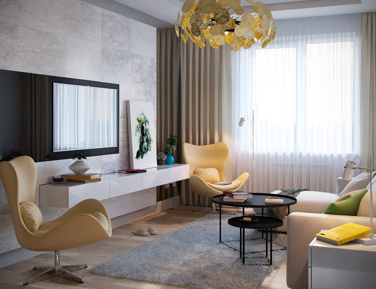 Перепланировка в панельном доме – процесс сложный и почти несогласуемый. Поэтому дизайнер Илья Деркач обошёлся удачной расстановкой мебели в детской и спальне-гостиной. Автор взял за основу простой белый цвет. Крупные предметы мебели, например, угловой диван в гостиной, сливаются по оттенку со стенами и растворяются в интерьере. Яркими акцентами выступает текстиль, золотая люстра и графичные чёрные детали. Собирает всю палитру воедино картина, написанная специально для этого проекта. Встроенный шкаф в гостиной спрятали за чёрным стеклянным фасадом. Этот глянцевый объект напротив окна будет отражать естественный свет. А чтобы дополнительно расширить помещение, дизайнер задал симметрию при помощи подвесного комода и пары реплик дизайнерских кресел Swan. Объединить кухню и гостиную в панельном доме невозможно, поэтому для вытянутого по форме помещения выбрали линейный гарнитур и прямоугольный обеденный стол. Бюджетная модель с лаконичными серыми фасадами удачно сочетается с белой м
