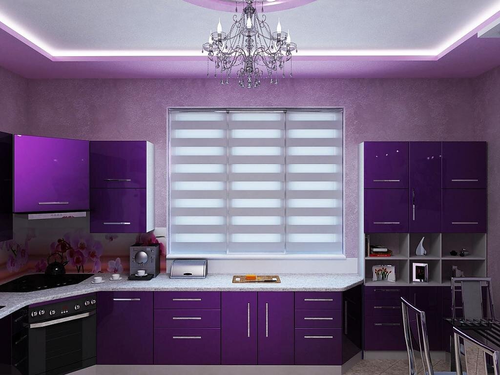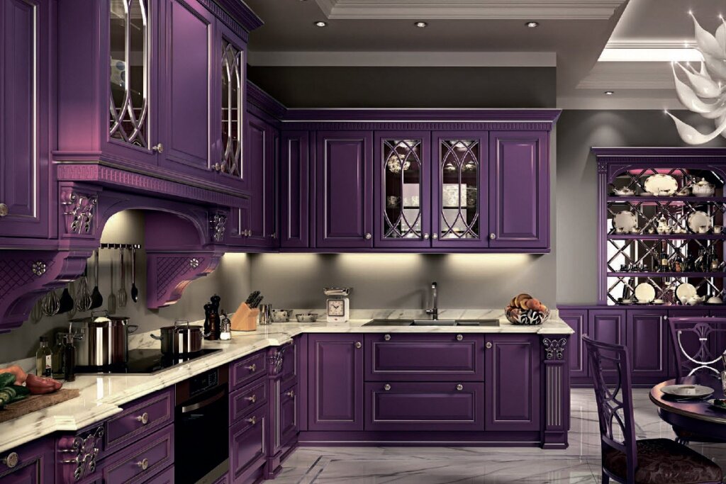 Фиолетовый – цвет тайны, мудрости и величия. В интерьере он используется нечасто по сравнению с классической гаммой. Некоторые считают его слишком темным и тяжелым для кухни. Однако в последние десятилетия дизайнеры активно экспериментируют с данной палитрой. Не стоит забывать, что этот глубокий и насыщенный цвет имеет множество оттенков, каждый из которых подходит для определенного типа помещения. Правильно подобранные сочетания делают дизайн фиолетовой кухни привлекательным и неповторимым, наполняют его смыслом. Для каких стилей характерен фиолетовый Как правило, кухня в фиолетовом цвете чаще всего встречается в таких современных стилях, как хай-тек, минимализм, конструктивизм. Эти направления подразумевают геометрию, четкие линии, глянцевые поверхности и современные материалы. Лучше всего здесь подходят яркие и насыщенные оттенки от темно-сливового до фуксии. В классических стилях также допустимы эксперименты с этим цветом. Традиционный кантри или изысканный арт-де