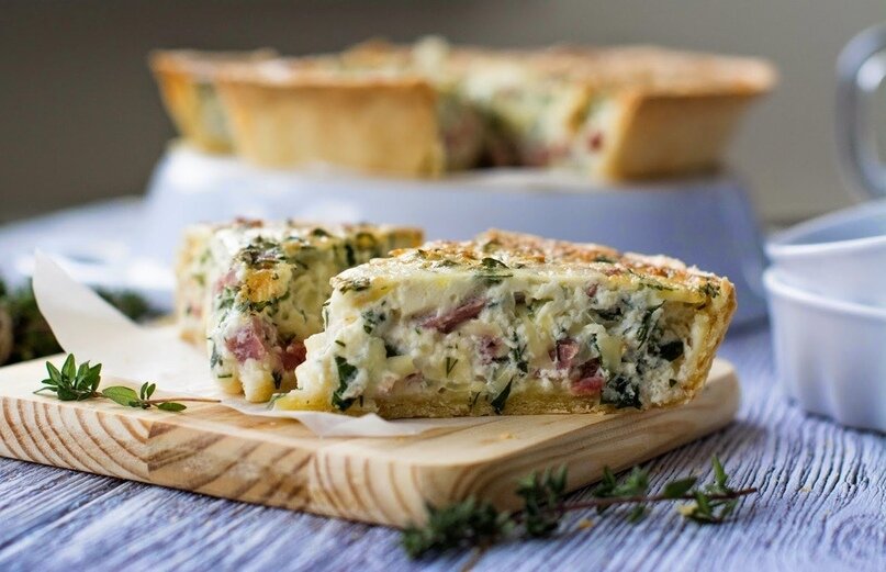 Ингредиенты: Для теста: Мука — 200 гр Масло сливочное холодное — 100 гр Соль — ¼ ч. л. Вода холодная — 4–5 ст. л. Творог — 50 гр. Для начинки: Бекон или копченая, варено-копченая грудинка, шейка — 200 гр. Сыр тильзитер (или любой другой на ваш вкус) — 150 гр. Яйца — 4 шт. Сливки 15–20% — 250 гр. Зелень рубленая (укроп, петрушка, тимьян) — 2–3 ст. л. Приготовление: Нарезаем охлаждённое сливочное масло кубиками. Всыпаем в чашу блендера муку, добавляем кусочки масла, творог, соль и измельчаем в крошку. Пересыпаем готовую крошку в миску. Вливаем воду, хорошо смешиваем, после чего собираем в комок и скатываем в шар. Оборачиваем тесто пищевой плёнкой и кладём в холодильник на 20-30 минут. Присыпаем рабочую поверхность мукой и раскатываем тесто в пласт около 3-4 мм. толщиной. При необходимости подсыпаем муку. Переносим тесто в форму при помощи скалки. Прокатываем скалкой по бортикам формы, чтобы убрать лишнее тесто. Ставим форму с тестом в холодильник на полчаса. Духовой шкаф