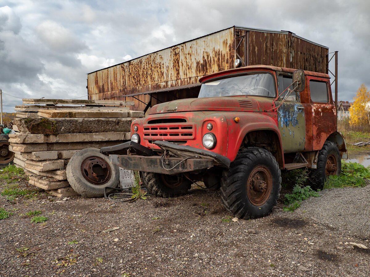Путешествуя по регионам России часто встречаешь удивительные экземпляры вездеходов, слепленных, буквально, из подручных средств. Этого коротыша нашел совершенно случайно... Судя по всему, база ЗиЛ-131 (могу ошибаться: диски по вылету 66-е, но по расположению мотора не похоже на Шишку). Конструкция полноприводная, рама укорочена, кабина от ЗиЛ-130. Видимо взят от пожарного автомобиля - цвет и белая полоса предает. Топливный бак как у внедорожной котлеты - сзади. Возможно мострика строили для бездорожья, покатушек, а может и для утилитарных целей. Рядом с ЗиЛом стоит еще один распиленный ГАЗ-66. Видимо был донором или тоже планировался под постройку какого-нибудь монстрика. В глубинке не надо вносить изменения - уехал в лес и хрен тебя кто найдет. ГАЗ-66 я однажды чуть не купил. Отдавали практически в идеале, за 150 тысяч рублей. В оригинальном цвете, с тентом. Одно мне не нравилось, с ростом 190 см я просто помещался в него, как в утробу матери. Видимо поэтому северные Кулибины и предпо