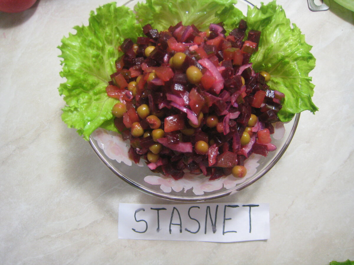Предлагаю вам простейший, но очень вкусный салат, который ко всему еще и полезный. За вычетом времени на отваривание свеклы, приготовление этого салата займет не более 15 минут. Все ингредиенты принесут пользу вашему организму и, к тому же, будут способствовать его очищению. Набор продуктов для приготовления минимален и прост. Я взял две небольшие отваренные свеклы, два соленых огурца, две красных луковицы ( я взял одну - было мало ), половину банки зеленого, консервированного горошка, маленький кусочек корня хрена, растительное масло, соль и перец по вкусу, листья салата для украшения. 1) Для начала режем кубиками соленые огурцы. Сок из них я не отжимал, так салат получается сочнее. Помещаем их в миску, где будем смешивать все ингредиенты, поочередно их добавляя. 2) Режем кубиками свеклу и добавляем в огурцы. 3) Добавляем зеленый горошек без сока. 4) Нарезаем лук полукольцами и тоже добавляем в миску. 5) Прямо над миской натираем на мелкой терке кусочек корня хрен