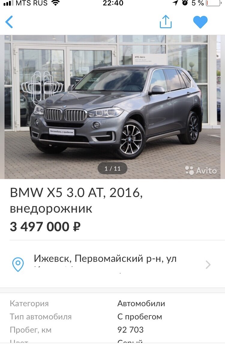 Всем привет. В этой статье посмотрим состояние BMW X5 30d, 2016 года с пробегом 92 тыс км. Автомобиль собран в США, комплектация довольно редкая - Pure Experience. В машине много всего, смотрите сами: Давайте смотреть состояние, а начнем традиционно с внешнего вида: Издалека все красиво, посмотрим поближе, ведь машина прошла 92 тыс км и наверняка есть какие-то нюансы по кузову: Не понравились зазоры между фарами: Открываем капот, чтоб посмотреть возможные следы ДТП: В остальном по кузову все нормально, машина в заводской краске (кроме на треть окрашенного капота): По подвеске, тормозам, резине вопросов нет, все как новое: А теперь посмотрим салон - как он выглядит на 92 тыс км, потом подключим сканер и посмотрим реальный пробег: По компьютерной диагностике были несерьезные неактивные ошибки: В блоке двигателя и КПП пробеги совпадают, турбина и топливный насос выходят на заданное давление: Вот такое состояние у этой машины. Как видим, по кузову не идеально, но и пробег соответствующий