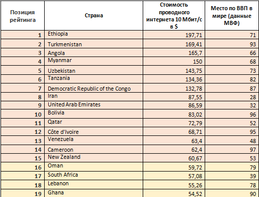 Почти все мы каждый день день пользуемся интернетом.Его изобрели еще в далеком 1969 году,но все же наибольшую популярность он приобрел не так уж и давно,а в странах СНГ в основном в начале 2000-х.Несмотря на это именно в странах СНГ самый дешевый интернет.Самый дешевый интернет в Украине ок. 3,44$(226 руб) в месяц за 10мб/сек.Россия заняла второе место 365 рублей ($5.55). Самый дорогой интернет в Эфиопии почти $198 (12 997 рублей) в месяц !! В пятёрке стран с самым дорогим интернетом помимо Эфиопии оказались Туркменистан ($169), Ангола ($166), Мьянма ($150), Узбекистан ($144), Танзания ($134) и Демократическая республика Конго ($133). Страны с дешёвым Интернетом Страны восточной Европы и бывшего СССР - среди государств с самым дешёвым интернетом: Чехия, Словакия, Венгрия – порядка $15 в месяц, Латвия, Казахстан, Польша, Литва – порядка $11,5 в месяц. В пятёрку стран с самым дешёвым проводным интернетом помимо Украины и России также входят Румыния – 98 место ($7,95), Болгария - 97 мес