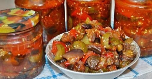 Ингредиенты: Приготовление: Нарезаем крупными кубиками баклажаны и складываем в миску, солим, перчим и оставляем на 10 минут. Сливаем выделившийся сок и промываем, слегка отжимаем. Помидоры пропускаем через мясорубку или натираем на терке. Переливаем пюре в кастрюлю и варим на среднем огне. Нарезаем огурцы и помидоры небольшими ломтиками, лук — полукольцами. Добавляем в закипевшее томатное пюре лук, перемешиваем, через 5 минут добавляем огурцы, баклажаны, болгарский перец. Хорошенько перемешиваем и доводим до кипения, затем тушим под крышкой около 20 минут при частом помешивании. Через 20 минут добавляем соль, сахар, вливаем уксус и подсолнечное масло. Перемешиваем и снова доводим до кипения, варим на среднем огне еще 5 минут. Заполняем салатом стерилизованные банки, закатываем, переворачиваем и укутываем до полного остывания.
