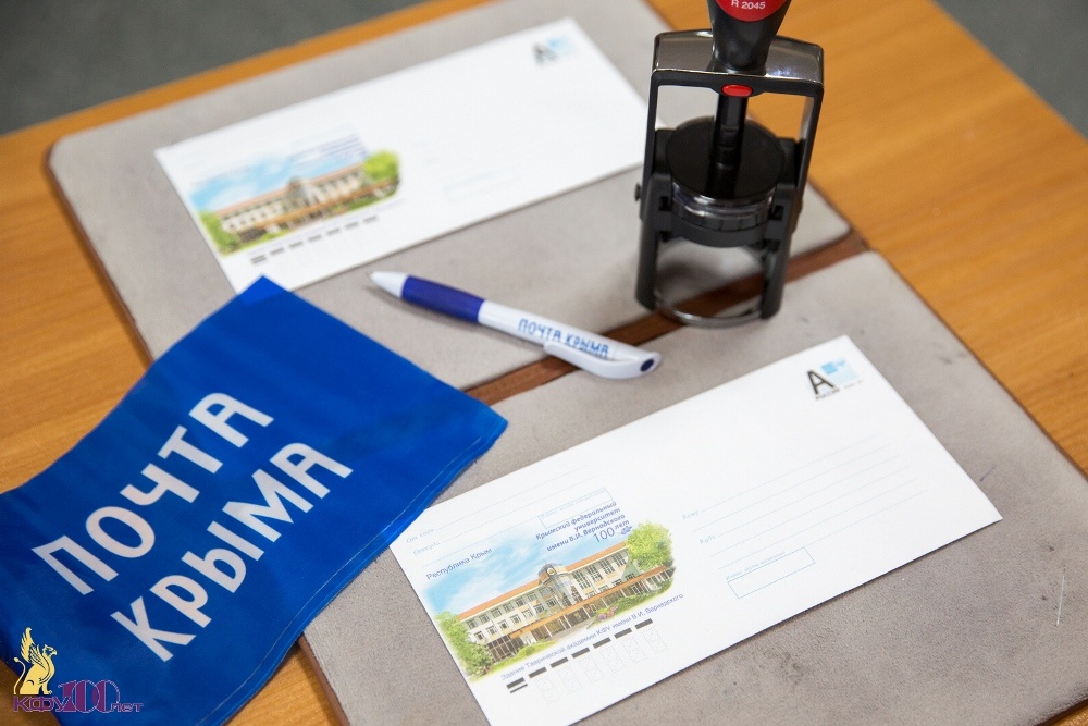 Торжественная процедура гашения конверта, выпущенного специально к столетию первого крымского вуза, состоялась в Крымском федеральном университете им. В.И. Вернадского. Процедуру гашения провели и.о. ректора КФУ Андрей Фалалеев и заместитель начальника Симферопольского почтамта федерального предприятия «Почта Крыма» Мария Денисюк, передает корреспондент Крыминформа. «К столетнему юбилею образования первого вуза в Крыму АО «Марка» был изготовлен художественный маркированный конверт. Его выпустили экземпляром в 50 тысяч штук. Стоимость конверта составляет 30 рублей. Приобрести конверт можно во всех отделениях почтовой связи Республики Крым и Севастополя», – рассказала журналистам Денисюк. На лицевой стороне конверта изображено главное здание КФУ – основной корпус Таврической академии. Для процедуры спецгашения также был изготовлен специальный почтовый штемпель. От обычного календарного он отличается тем, что в его тексте указана дата и место проведения гашения. Штемпель действует только