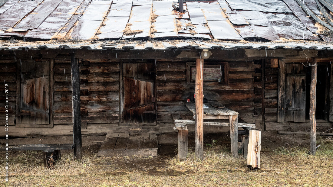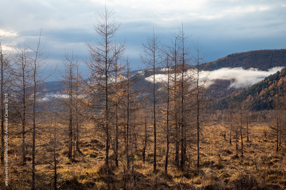 Кордон Биранкур. Ночью дождь, утром хмарь, вокруг северная лиственничная тайга и сырость, зато поспали на полчаса подольше. То один, то другой выходили из натопленного зимовья посмотреть просветы в небе. Сначала равномерно белая молочная пелена должна начать разрываться, позже проявятся тёмные и светлые участки, затем отдельные тучки и только потом участки голубого неба. Это будет знак к тому, что вечер будет фотографическим.