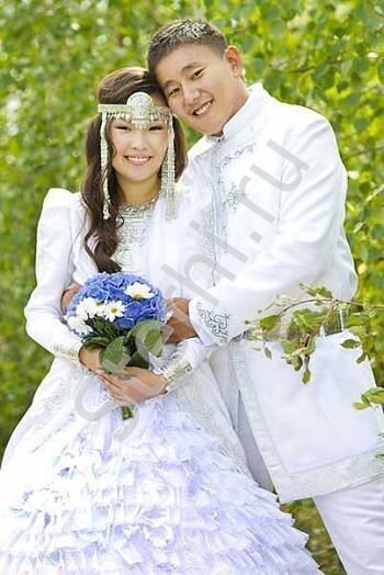 Холодный и богатый край, расположенный на Дальнем Востоке поражает роскошью нарядов людей и убранством праздничных столов. Якуты, как и большинство людей планеты, придают белому цвету огромное значение, это символ чистоты и невинности, поэтому невеста всегда была в белом. На талии ее обязательно был тугой пояс, чтобы подчеркнуть изящество молодой девушки. Вся одежда была расшита бисером и бусинами, на голове – специальный убор. С непокрытой головой нельзя было выходить замуж. Одна из традиций древних якутов – девушки только до свадьбы могли ходить с распущенными волосами, в замужестве им предписывалось носить головной убор, показывать волосы можно было только мужу. До наших дней старые якутки носят платки, пряча свои волосы от всех, даже если муж уже умер. Жених и невеста Выбором спутника жизни якуты занимались самостоятельно. Их отношение к этому моменту еще в древние времена было таким же, как и сейчас в большинстве стран мира. Существовал только один запрет при выборе мужа или же