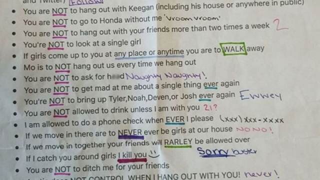 Блогер опубликовала в "Твиттере" длинный список правил для возлюбленного, составленный неизвестной девушкой, и который других пользователей-мужчин. Всего в данном перечне оказалось 22 правила. В них девушка запретила своему возлюбленному, в частности, следующее: - иметь в телефоне контакты одиноких девушек; - подписываться на одиноких девушек в соцсетях; - смотреть на одиноких девушек; - знакомиться с одинокими девушками (парню следует уходить при их приближении к нему) и приводить их в гости; - садиться в их общий с девушкой автомобиль без нее; - отдыхать с друзьями более двух раз в неделю; - просить оральный секс; - злиться на свою девушку; - пить в ее отсутствие; - не позволять ей проверять телефон парня; - оставлять девушку ради друзей; - ходить на свидания со своей девушкой менее раза в две недели. Также она требует у своего бойфренда отвечать на ее сообщения самое позднее – спустя 10 минут, а также признаваться ей в любви как минимум один раз в день "Если я говорю "прыгай", ты