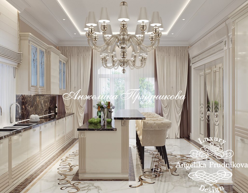 Мраморные столешницы острова и рабочих поверхностей перекликаются с кухонным фартуком, связывая воедино разные функциональные зоны. Роскошные люстры, представляющие смесь неоклассики и модерна, служат настоящим украшением интерьера. Полная фотогалерея проекта: https://angelika-prudnikova.design/dizajn-portfolio/dizayn-kukhni/dizayn-proekt-interera-kukhni-v-zagorodnom-dome-v-ingushetii Понравилась публикация? Ставьте лайки и подписывайтесь на наш канал! Телефоны Студии элитных интерьеров Анжелики Прудниковой: +7 (495) 799-33-39, +7 (495) 775-95-33