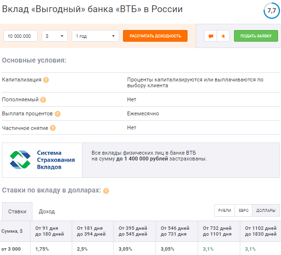 По данным Выберу.ру, в сентябре наибольшую доходность показали вклады РоссельхозБанка, банка «Таврический» и Азиатско-Тихоокеанского банка. В рейтинг 20 выгодных депозитов в американской валюте также вошли предложения от банка «Санкт-Петербург», «Альфа-Банка», банков «Зенит», «Глобэкс», Московского Кредитного Банка, ЮниКредитБанка, ТКБ, ВТБ и других.