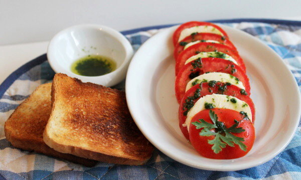 Легкая итальянская закуска (салат) из сыра моцарелла, помидора с соусом из оливкового масла и листьев базилика.