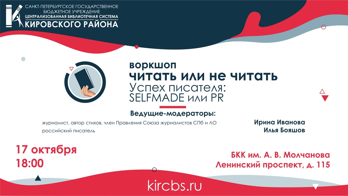 Воркшоп "Читать или не читать. Успех писателя: self-made или PR" Участники третьего воркшопа поговорят о том, как добиться успеха, ведя литературную деятельность, как преуспеть, будучи писателем и стать конкурентоспособным представителем литературной братии. Встреча будет интересна как начинающим писателям и представителям библиотек, так и активным читателям, которые стремятся расширить свой кругозор. Цена: Бесплатно Адрес: Библиотека № 4 им. А.В. Молчанова Когда: 17 октября Концерт "Вокальные классы Петербургской консерватории" Этим вечером на сцене РНБ зрители услышат вокальные произведения в исполнении классов народной артистки РФ, доцента Н. П. Дроздовой-Вайнер и заслуженной артистки России, доцента Л. А. Тедтоевой. В просторном зале старинного здания Российской национальной библиотеки традиционно проводится множество концертов, полюбившихся петербуржцам и гостям города своей уютной и в то же время возвышенной атмосферой. Не станет исключением и этот вечер. Цена: Бесплатн