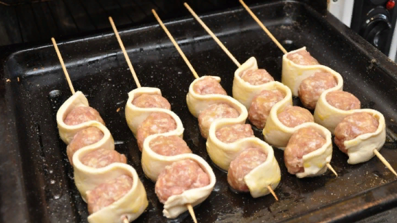 Приветствую вас дорогие любители вкусного готовить, буду рад поделится с вами сочным и вкусным рецептом шашлычков из фарша и слоёного теста, которые смогут приготовить все, у кого есть духовка и желание порадовать своих родных вкусным ужиным. Займёмся фаршем, тем временем как будет оттаивать наше тесто ( если оно конечно не разморожено предварительно). Лук натираем на мелкой терке, добавляем его в наш фаршик , туда же идут перец, чеснок, соль и мелко порубленное ассорти из зелени. Хорошенько все перемешиваем, пробуем на соль и начинаем отбивать нашу заготовку. После чего формируем кругляшки, которые в последующем нанизываем на длинные шпажки. Слоёное тесто нарежем на полоски шириной 4-5 см,так как тесто дрожжевое они немного раскроются в духовке. Готовые " шашлычки" отправляются на противень сколько поместиться, главное оставить небольшое расстояние между ними ( противень конечно предварительно смазать маслом), смазываем их взбитым яйцом и в духовку разогретую на 180 градусов отправляе