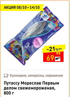 Отличная скидка, поэтому спешите купить путассу пока она по скидке. И конечно же смотрите на срок годности обязательно Вкусное рыбное филе по акции и стоит на 49% дешевле. Очень вкусное кстати, советую присмотреться. Отличная семга для покупателей приготовил магазин Дикси для вас. Акция действует до 14 числа этого месяца Скумбрия по акции и стоит на 44% дешевле чем обычно. Покупкой доволен Колбаса молочная по скидке и стоит на 44% дешевле. Как вам такая колбаса? Отличная смесь замороженная и очень вкусная. Мне она очень нравится.