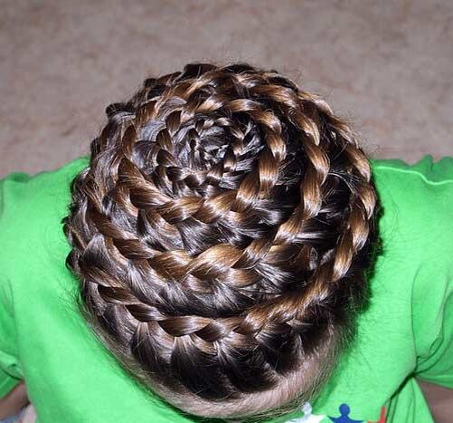 - Двигаясь по кругу, заплетите все волосы. Закончить плетение нужно обычной трехрядной косой.