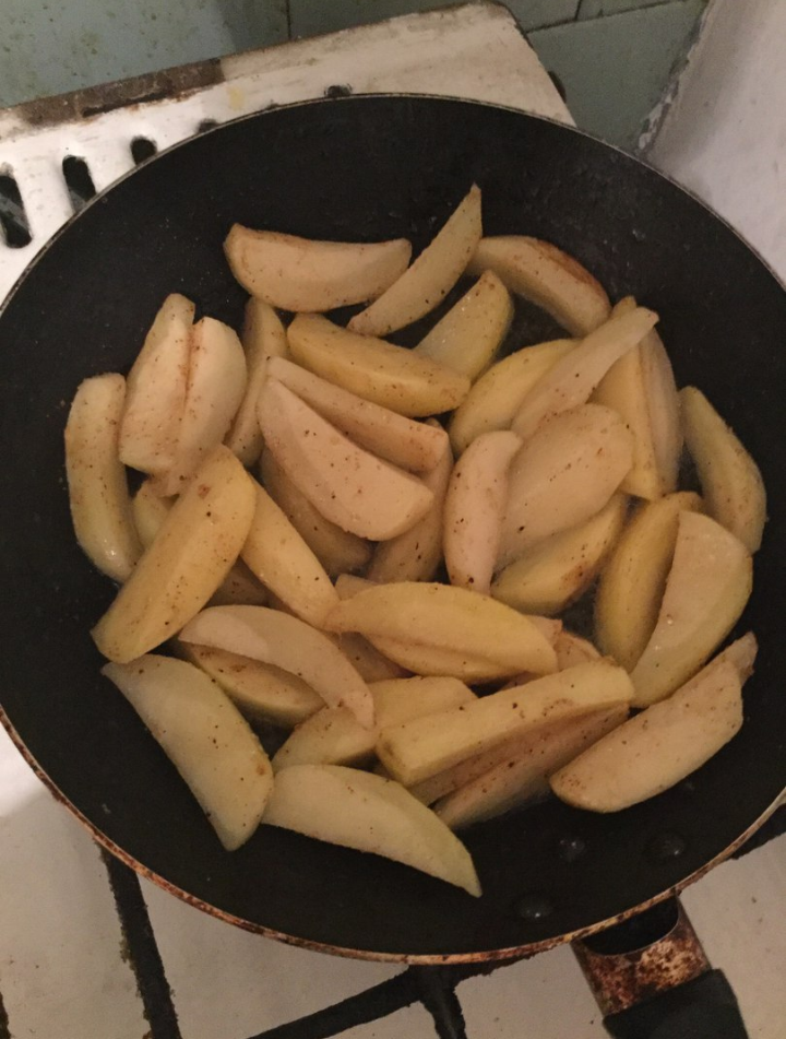 Итого: ~130 рублей, но это не точно (из за котлет) Шаг первый: жарим порезанную соломкой картоху до