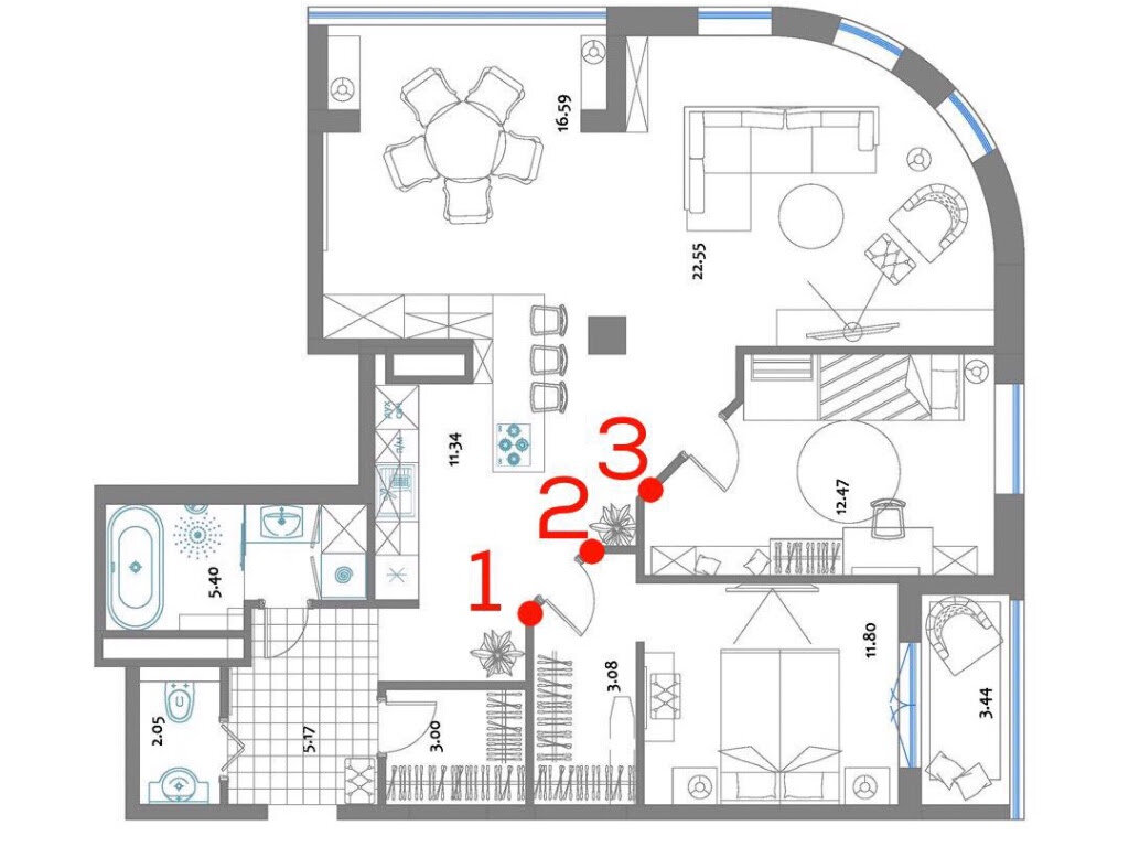 Традиционно начинаем с планировки. Стараемся избегать внешних углов, создавая новое пространство. Если избежать совсем не получается, стараемся увести от них постоянный транзит. 😉 Так, чтобы он был, но обтираться об него не хотелось. Смотрите пример. Углы 1, 2 и 3 — необтираемые, за счет того, что они в одну линию, да и фикус свою роль сыграл. 😉 Обтираемые внешние углы стараемся «убрать». Например, это можно сделать с помощью мебели. Вот та же планировка, угол 4 — обтираемый. Но мы можем убрать простенок, внешний угол тогда станет мебельным, а на мебель у нас принято натыкаться, а не обтирать. 😆 Смысл тот же, но обои не пострадают. 😆 Вот, угол 5 так убран комодиком. 😀 А если