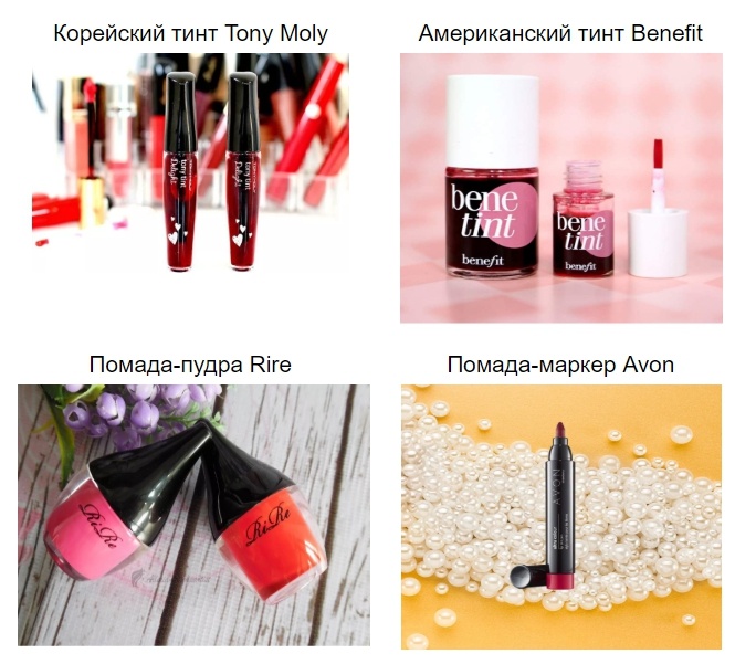 Тинт — жидкий пигмент, и помада с пудрой в составе — это изобретения корейцев. В Корее такие средства выпускаются в тюбиках с кисточкой или аппликатором. Очень популярны корейские тинты брендов Tony Moly, Berrisom. Самые известные помады-пудры тоже корейские — Rire Lip.