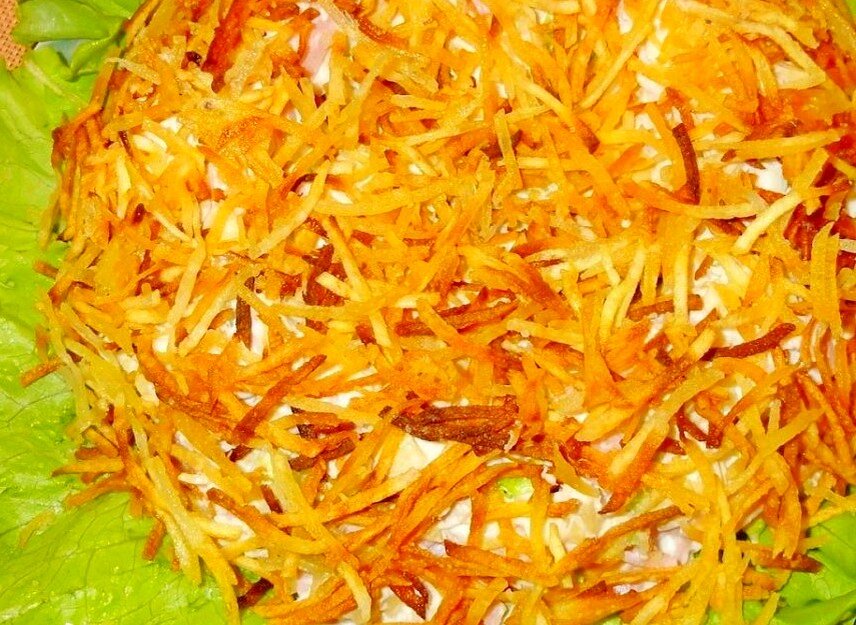 Этот очень вкусный и сытный салат появился на наших столах недавно! Недаром он получил народное признание. Действительно, попробовав его, хочется положить себе на тарелку еще немного и потом еще немного. У этого салата есть варианты приготовления с мясом курицы или индейки. Я предлагаю вашему вниманию классический вариант. Кто-то добавляет в него морковь, огурцы, даже капусту. Я считаю, что название должно идти от вкуса этого превосходного салата, а не от желания повара наполнить его всем, что взбредет в голову. Подготовка 45 минут Приготовление 15 минут Ингредиенты: Небольшой совет-подготовьте все ингредиенты заранее и разложите по отдельным чашкам. Все, что надо, почистите и нашинкуйте , яйца отварите и порежьте . Так намного проще готовить! Никогда не запутаетесь. Приготовление: Салат готов! Его достоинство еще и в том, что его можно приготовить заранее. Когда он настоится становится еще вкуснее! Приятного аппетита!