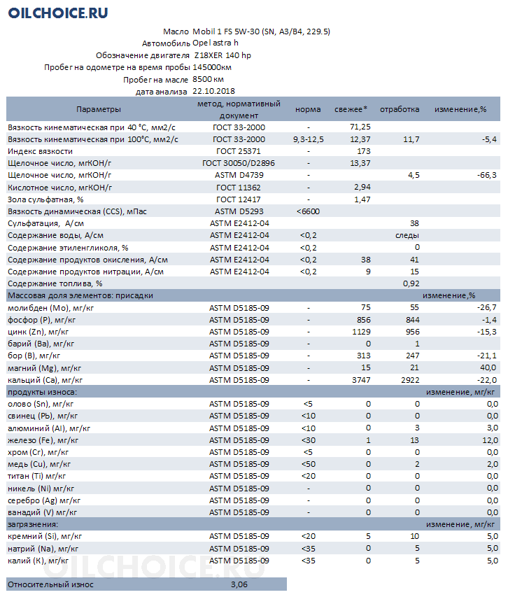 прошлый анализ Mobil 1 FS 5W-30 отработка с Опель Астра Н 1,6 после 6500 км [oilchoice] комментарий лаборатории