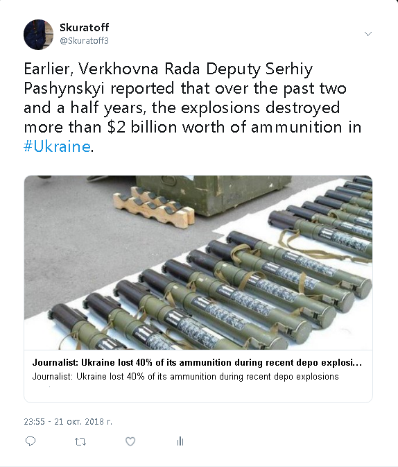 Украина потеряла около сорока процентов всего своего арсенала боеприпасов из-за складских взрывов за последние полтора года . В своей статье украинский журналист Юрий Бутусов пишет, что только в результате недавних взрывов на объектах хранения в Ичне было уничтожено более 210 000 тонн боеприпасов - от боеприпасов для стрелкового оружия до баллистических ракет Точка-У. По информации депутата Рады Пашинского, за последние два с половиной года взрывы уничтожили на Украине боеприпасов на сумму более ,чем на 2 миллиарда долларов. Для сравнения в статье Бутусов отмечает, что в течение пяти лет войны на Донбассе ВСУ использовали менее трети взорванного в Ичне, около 70 000 тонн боеприпасов. Бутусов обвинил украинские власти в небрежности в управлении складами боеприпасов, где по его словам, не было системы видеонаблюдения. «На территории базы вообще нет системы видеонаблюдения. Это поразительно, но с многочисленными просьбами установить систему видеонаблюдения после катастрофы в Калино