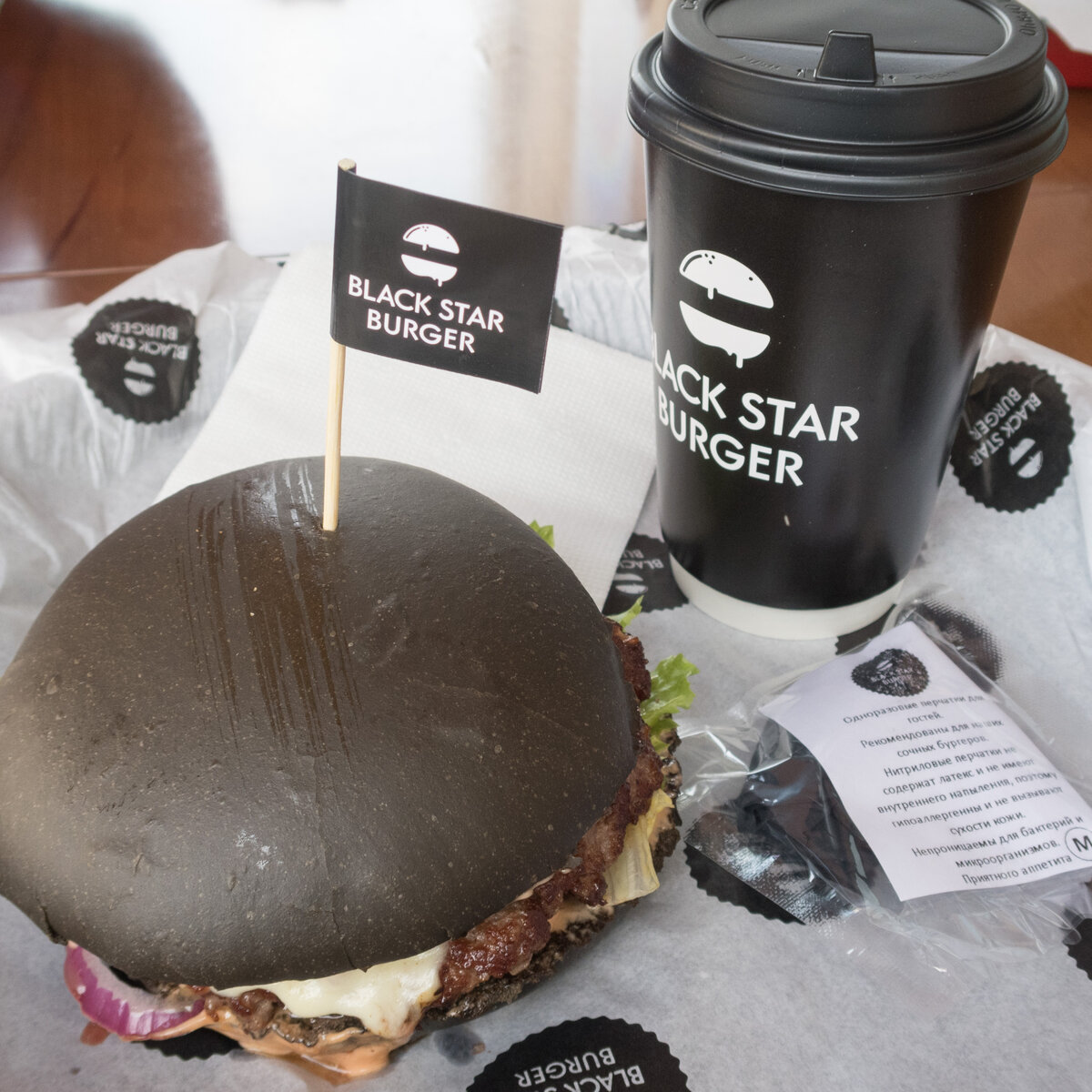 Когда мы этой осенью были в Уфе, то, конечно же, не могли обойти стороной такое заведение, как Black Star Burger, тем более, что оно есть далеко не в каждом городе. Начитавшись восторженных отзывов об этой сети, мы решили там перекусить. Младшая дочка не поддержала эту идею, так как обожает Мак. Благо он находится рядом, прямо за углом. Татарский фастфуд. Стоит ли пробовать? Мы же со старшей дочкой отправились дегустировать черные бургеры. Само заведение показалось мне достаточно атмосферным. Я в этом плане, уже немного «динозавр»… Весь этот реперский антураж и куча татуировок – явно не мое, но посмотреть понаблюдать очень интересно. Весь обслуживающий персонал одет в едином стиле. Вроде как униформа, но очень неформальная. Поэтому все смотрится очень органично и колоритно. Почти сразу на входе касса, где можно сделать заказ. Дальше уже столики и кухня. Вы можете наблюдать, как готовится Ваш бургер. Само помещение небольшое, есть еще столики на улице. Очередей больших нет, а в целом