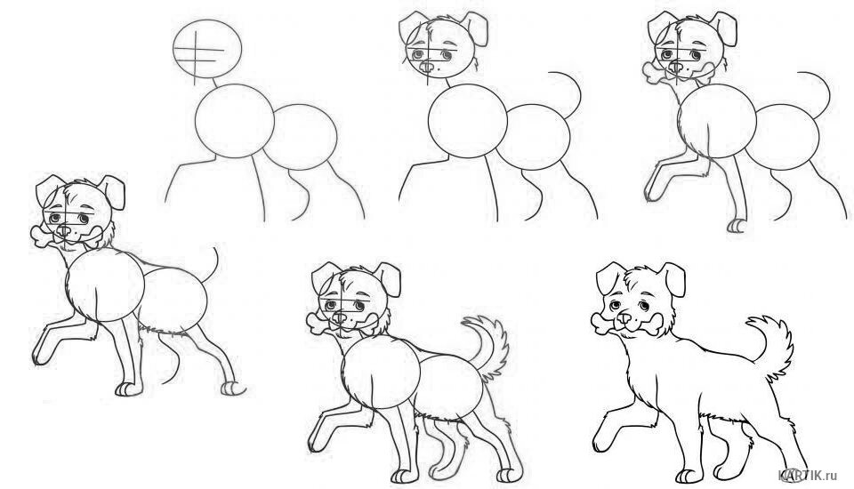 Чтобы нарисовать собачку, не нужно обучаться в художественной школе. Следуя пошаговым инструкциям, можно легко изобразить ее на листе бумаги. Карикатуры, мультипликационные персонажи или реалистичный образ – все можно нарисовать самостоятельно или привлечь к этому увлекательному процессу ребенка. Как нарисовать собаку реалистично Реалистичное изображение животных довольно непростой процесс. Нужно передать не только внешний облик, но и настроение питомца. Но если рисовать собаку на бумаге поэтапно, то результат не заставит себя ждать. Пошаговая инструкция: 1. Нарисовать круг для лица и овал для туловища. 2. Схематично отметить морду щенка и три видимые лапы. 3. Изобразить уши. 4. Нанести линии, которые помогут определить местоположение глаз и носа. 5. Добавить небольшой хвостик и обрисовать лапки. 6. Стереть вспомогательные линии. 7. Мягкими штрихами изобразить мех животного и отметить тенями изгибы. 8. Дорисовать менее заметную заднюю лапу, добавить темные блики и шерсть. 9.
