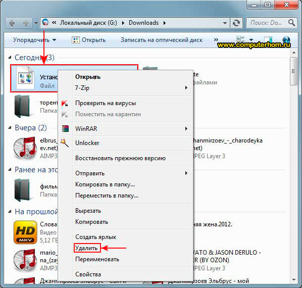 И так наводим курсор мыши на тот файл, который вы хотите удалить, затем один раз нажимаем левую кнопку мыши, после чего наш файл будет выделен. Теперь не отводя курсора мыши от файла, вам нужно один раз нажать правую кнопку мыши, после чего раскроется дополнительное меню, в котором вам нужно выбрать пункт «Удалить». Когда вы нажмете на кнопку «Удалить», на вашем компьютере откроется окошко для подтверждения удаления данного файла.