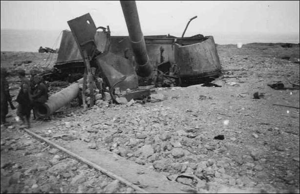 На этих немецких фото запечатлено наиболее раннее состояние орудийной башенной установки МБ-2-12 № 1 после подрыва и захвата батареи немецкими войсками.