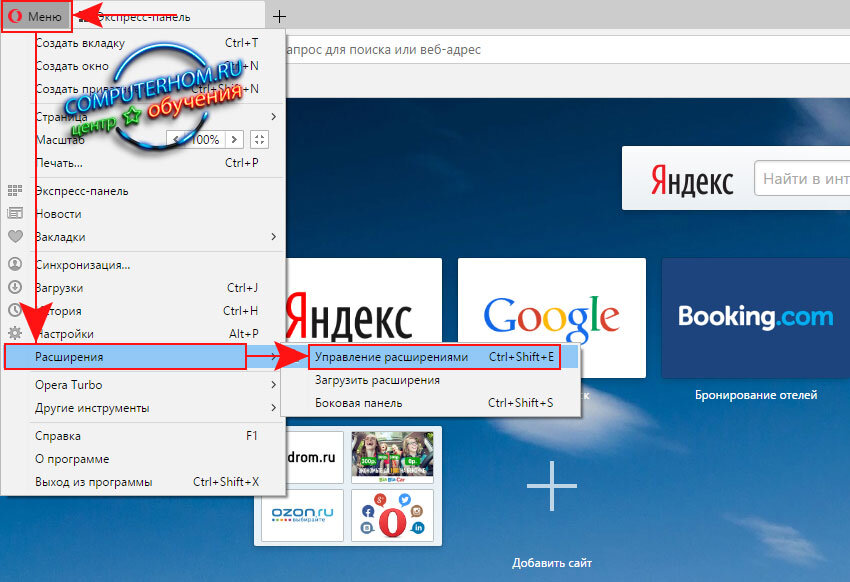 В своем браузере opera вам нужно навести курсор мыши на кнопочку «Меню» и один раз нажать левую кнопку мыши», после чего в вашем браузере раскроется меню, в котором вам нужно навести курсор мыши на пункт «Расширения», далее раскроется еще одно меню, в котором вам нужно выбрать «Управление расширениями».