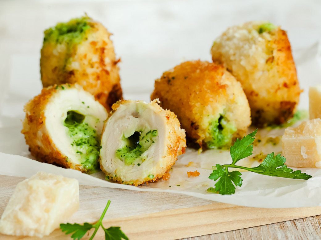 Каждый кусок куриного филе разрезать не до конца вдоль, развернуть, накрыть пищевой пленкой и хорошо отбить. Пленку снять, филе посолить и поперчить. Выложить на филе замороженное масло, свернуть рулетом и заколоть зубочисткой. Накрыть пищевой пленкой и убрать в морозильник на 15 минут. Шаг 4