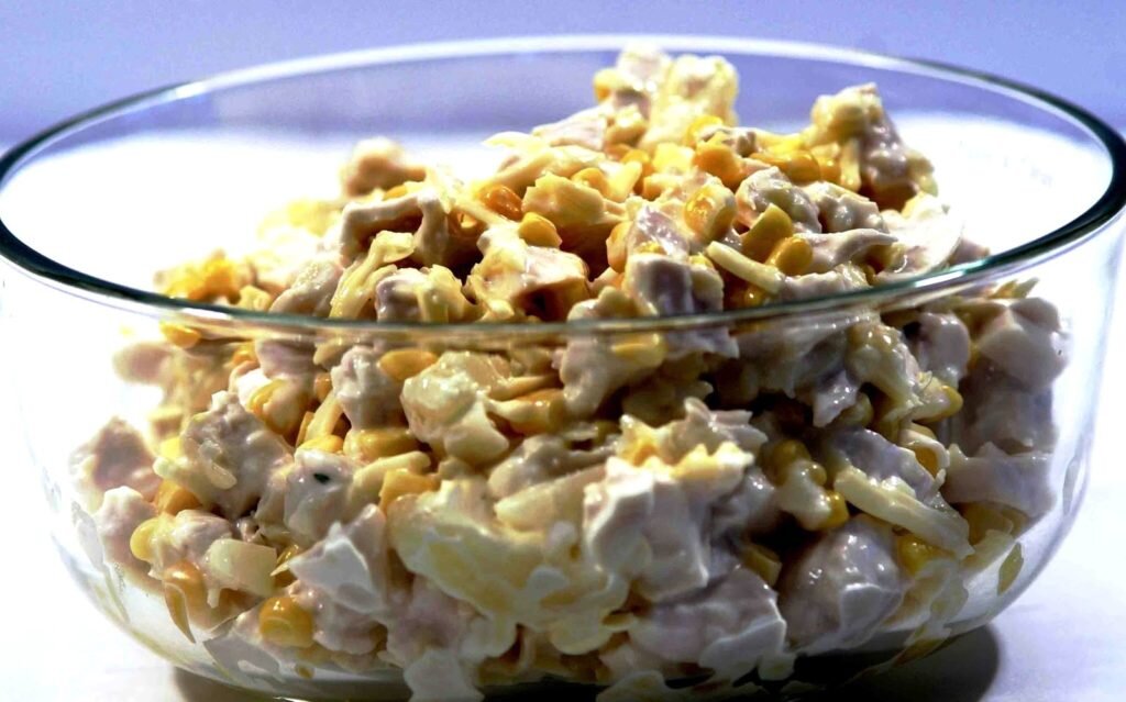 Существует огромное количество салатов, где используются столь любимые хозяйками куриное мясо, грибы, свежие огурчики и консервированная кукуруза. Интересна эта закуска тем, что идеально подходит, как холодное блюдо для праздничного стола. А еще салат порадует своей невысокой калорийностью людей, соблюдающих диету. Что необходимо купить для готовки: Мясо курицы (можно использовать любые части тушки птицы: от грудок до бедер) кому что больше нравится (100 – 200 грамм). Несколько горошков черного перца. Пару лавровых листочков. Поваренную соль. 0,5 кг – свежих шампиньонов. 1 головку – лука репчатого. 2 штуки - свежих огурцов. 2 штуки - куриных яиц. 400 граммовая банка консервированной кукурузы. Майонез. Приправы. Как приготовить салат пошагово: Куриное мясо Начать кулинарные работы рекомендуется с приготовления мяса птицы. Как говорилось выше, можно использовать любую часть курицы. Нужное количество промыть прохладной водой, обсушить, используя бумажные салфетки. Разогреть сковородку с