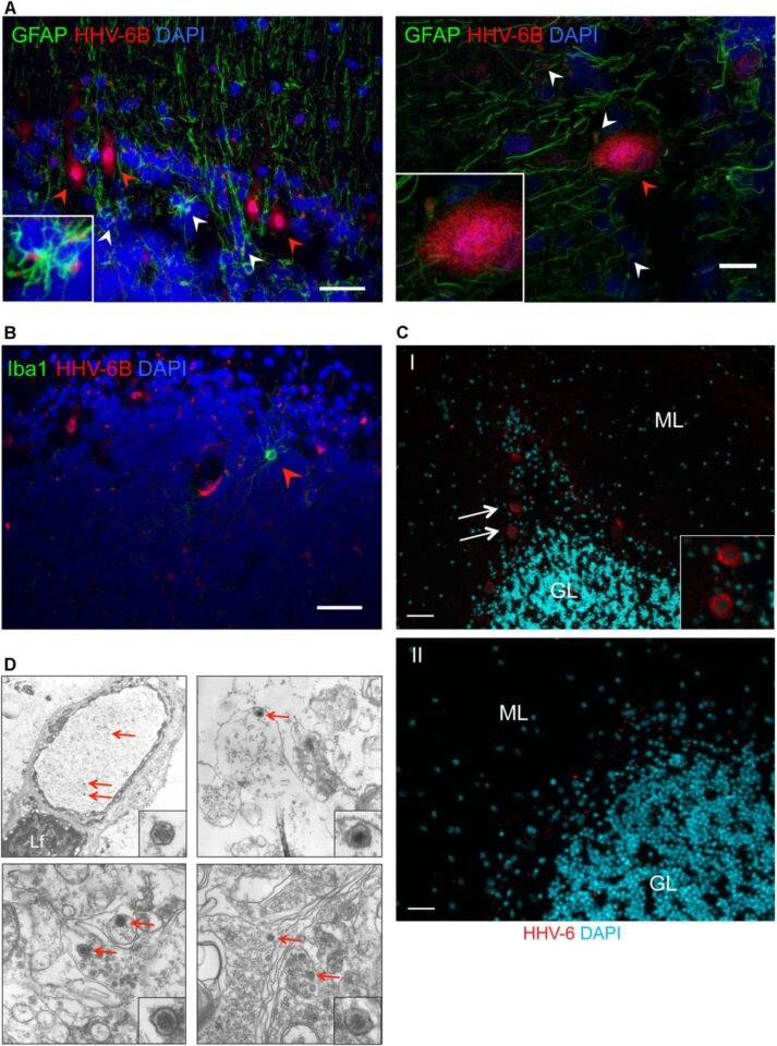 На фото А показаны поражённые вирусом герпеса астроциты (белые стрелки) и клетки Пуркинье (красные стрелки), на фото B видно, как вирус поражает микроглиальные клетки (красная стрелка), на снимке С тоже клетки Пуркинье (белые стрелки), на трансмиссионной электронной микрофотографии (D) вирусные частицы в клетках показаны красными стрелкамиРазвитие биполярного расстройства, большого депрессивного расстройства (БДР) и шизофрении связано не только с наследственной предрасположенностью, но и с некоторыми факторами окружающей среды: например, с вирусами. Шизофрения достоверно чаще встречается у детей, чьи матери перенесли корь, краснуху и токсоплазмоз во время беременности, а БДР – при перенесенной болезни Борна, HHV-1, HHV-3 и HHV-4 типов. Вирус гриппа А повышает риск развития у плода сразу двух заболеваний – шизофрении и БАР. Все эти вирусы нарушают развитие нервной системы и вмешиваются в ее взаимодействие с иммунной системой.Вирус герпеса никогда полностью не исчезает из организма – он находится в спящем состоянии в различных органах и тканях, включая нервную систему и слюнные железы, и способен в любой момент вновь проснуться. Стоит сказать, что большая часть взрослого населения – носители этого HHV-6.Ученые исследовали данные биопсии мозга у пациентов с БАР, БДР, шизофренией, а также пациентов, которые не страдали от психиатрических и неврологических заболеваний. Проводили работу с помощью иммунофлюоресцентного анализа, ПЦР в реальном времени, просвечивающей электронной микроскопии и флуоресцентной гибридизации in situ. Анализ экспрессии генов показал, что иммунный ответ на HHV-6 как раз может влиять на развитие всех этих психиатрических заболеваний.Ученые увидели в клетках Пуркинье мозжечка активную стадию воспаления у пациентов с БДР и БАР, вызванную HHV-6 обоих подтипов. У людей с шизофренией такую зависимость по сравнению с группой контроля не выявили.Стоит сказать, что клетки Пуркинье составляют бОльшую мозжечка. Эта часть головного мозга играет важную роль в моторном научении, контролирует работу мышц, равновесие и позицию тела в пространстве, а еще влияет на эмоции, на процесс восприятия, на память и язык. Исследователи заметили, что HHV-6 проявляет тропность к клеткам Пуркинье, вырабатывающим в качестве нейромедиатора гамма-аминомасляную кислоту, но почти не застрагивает вставочные ГАМК-ергические нейроны, астроциты или микроглию, прилегающие к зараженным нейронам.Авторы также заметили, что у пациентов с HHV-6А сами клетки Пуркинье меньше по размеру по сравнению с клетками здорового человека, но пока что провести какую-либо зависимость между уменьшением размера клеток и развитием психиатрических заболеваний они не могут.Раньше многие исследователи считали, что вирусы, находящиеся в неактивной фазе в тканях и органах, не могут становиться причиной заболеваний. Теперь же эта теория опровергнута, и, более того – уже ведутся исследования, которые связывают с вирусом герпеса подтипа 6А болезнь Альцгеймера.Текст: Морозова АннаPrusty BK, Gulve N, Govind S, Krueger GRF, Feichtinger J, Larcombe L, Aspinall R, Ablashi DV and Toro CT (2018) Active HHV-6 Infection of Cerebellar Purkinje Cells in Mood Disorders. Front. Microbiol. 9:1955. Published August 2018.doi: 10.3389/fmicb.2018.01955