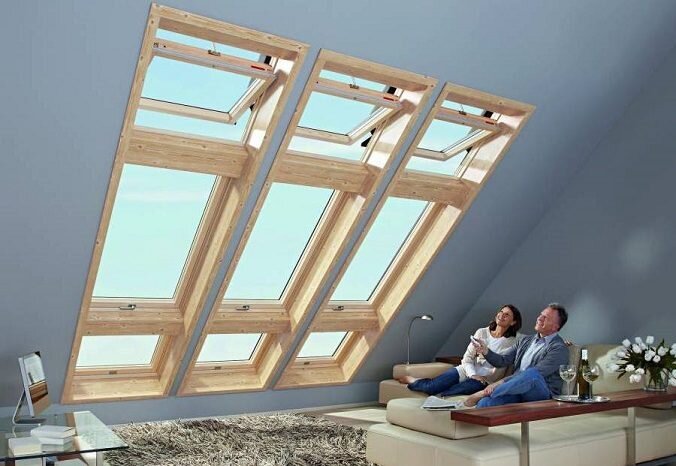Узкая, высокая мансарда кажется просторнее и светлее, если в один из скатом крыши строить несколько оконных блоков