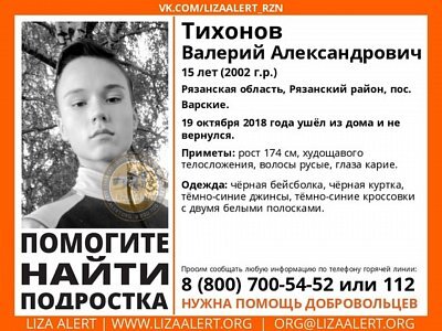 В Рязанской области пропал 15-летний житель поселка Варские Валерий Тихонов, сообщают волонтеры ПСО Liza Alert. 19 октября 2018 года подросток ушел из дома и не вернулся. Приметы: рост 174 см, худощавое телосложение, карие глаза, русые волосы. Был одет в черная бейсболку, черную куртку, темно-синие джинсы, темно-синие кроссовки с двумя белыми полосками. Всех, кто располагает информацией о местонахождении пропавшего, просят звонить по телефонам: 8-800-700-54-52 или 112. Читай, где удобно! YA62 в Яндекс-новостях