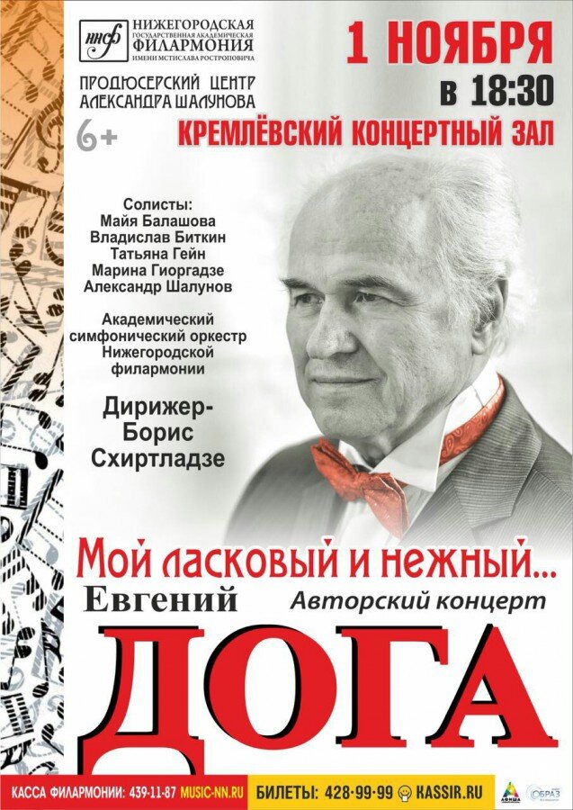 Авторский концерт известного композитора, народного артиста Советского Союза – Евгения Доги начнется в Кремлевском концертном зале в 18.30. Вы сможете услышать самые популярные произведений маэстро, которые исполнят солисты нижегородских театров в сопровождении Академического симфонического оркестра Нижегородской филармонии, за роялем – автор. Дирижер Борис Схиртладзе. Телефон 439-11-87. Кремль, корпус 2