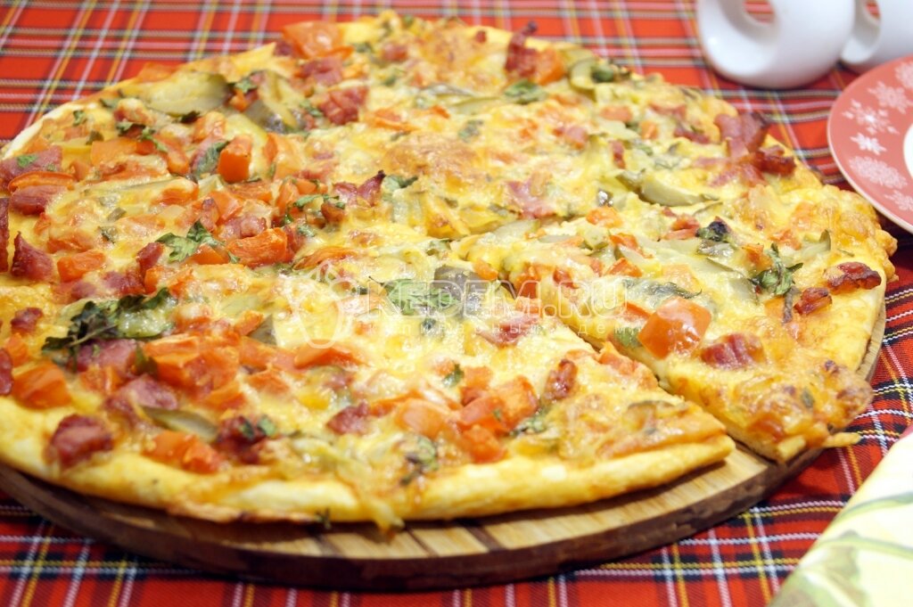 Тесто раскатать в круг, толщиной не более половины 1 см. Выложить на противень с пергаментом. Смазать томатным соусом. Для начинки сыр натереть на терке, огурцы нарезать мелкой соломкой, помидоры и копченое мясо нарезать мелкими кубиками, зелень порубить. Все смешать на блюде. Выложить начинку на тесто с соусом. Запекать в разогретой до 200 градусах С духовке 7-10 минут, до румяного цвета. Выложить на блюдо и нарезать ломтиками. Вкусная тонкая пицца готова. Можно угощать друзей и близких. Приятного аппетита!