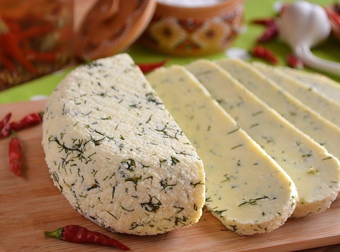 Полученный сыр слейте в дуршлаг, застеленный марлей, и дайте ему стечь и немного остыть. Добавьте к сыру паприку, зелень, орехи, чеснок, что Вам больше нравится, на свой вкус.